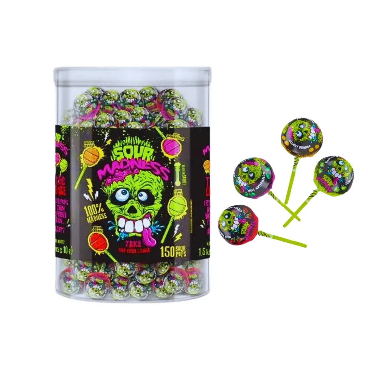 De zure uitdaging van Sour Madness, dit keer in de vorm van een lolly. Maak kennis met de volgende smaken: Bloody Orange, Neon Cherry, Hell Watermelon en Slime Apple. Durf jij de uitdaging aan?